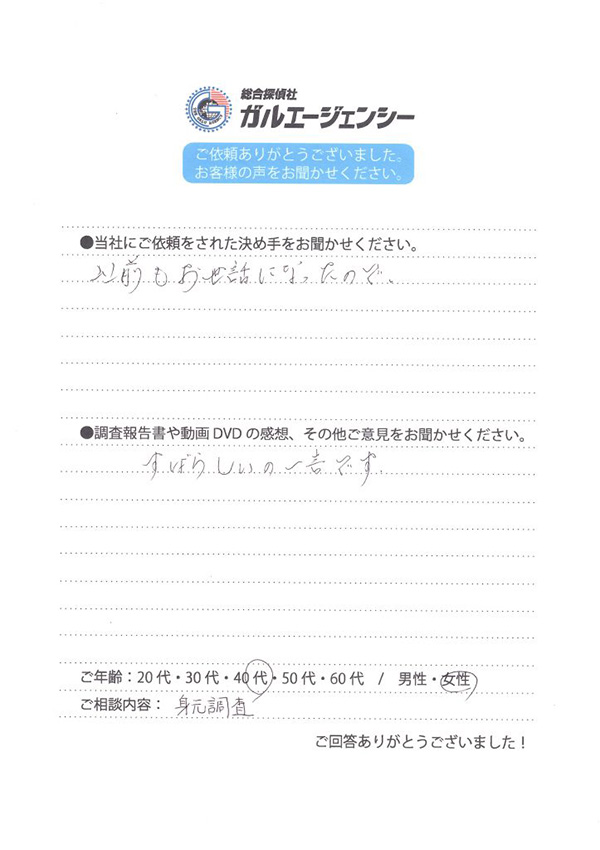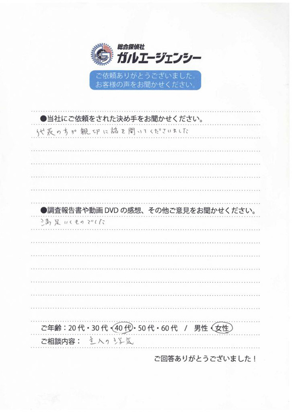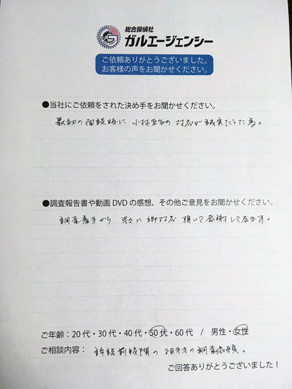 ご依頼者様にご協力いただきました、「お客様アンケート」を社員全員が共有し、調査サービスの品質向上に活用させていただいております。また、相談のお電話を迷われているお客様の、参考になりましたら幸いです。(ご紹介するアンケートは、全てお客様の了承を得た上で掲載させて頂いており ます。)